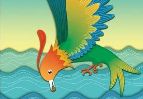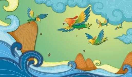 精卫痛恨无情的大海夺去了自己年轻的生命,她要报仇雪恨。因此,她一刻不停地从她住的发鸠山上衔了一粒小石子,展翅高飞,一直飞到东海。她在波涛汹涌的海面上回翔阒,悲鸣着,把石子树枝投下去,想把大海填平。